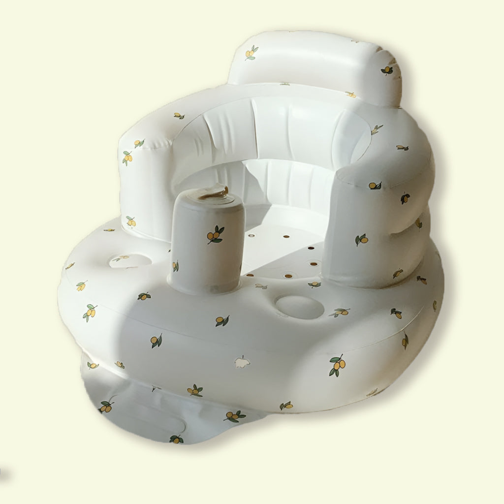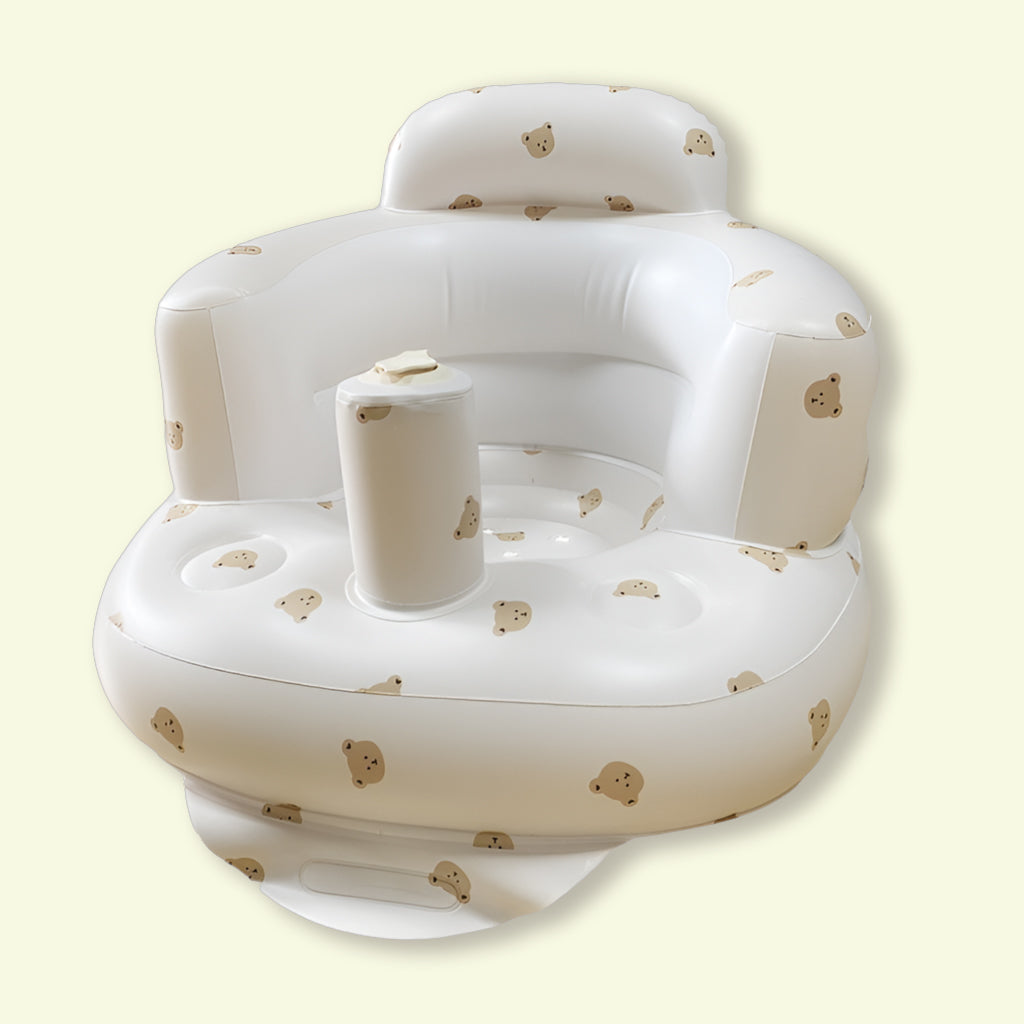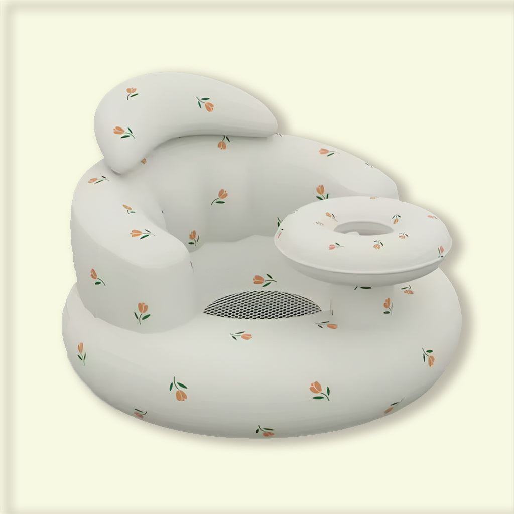 De opblaasbare structuur is ontworpen met veiligheid en stabiliteit in gedachten. De zachte randen en rugleuning geven extra ondersteuning, terwijl het middenstuk met beenopening zorgt voor een natuurlijke, comfortabele zithouding. Zo kan je baby rechtop zitten, spelen of genieten van een snack – terwijl jij je handen even vrij hebt.